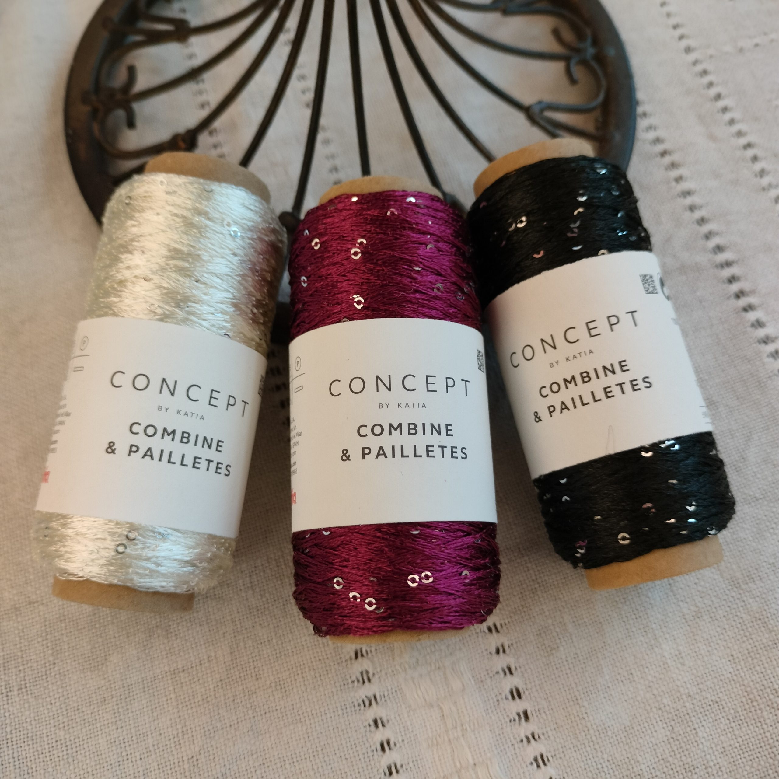 Katian Combine & Pailletes lanka on tarkoitettu neulottavaksi toisen langan kanssa tuomaan neuleeseen hieman kimalletta. Lanka on ohutta hieman kiiltävää ja siinä on pieniä paljetteja.