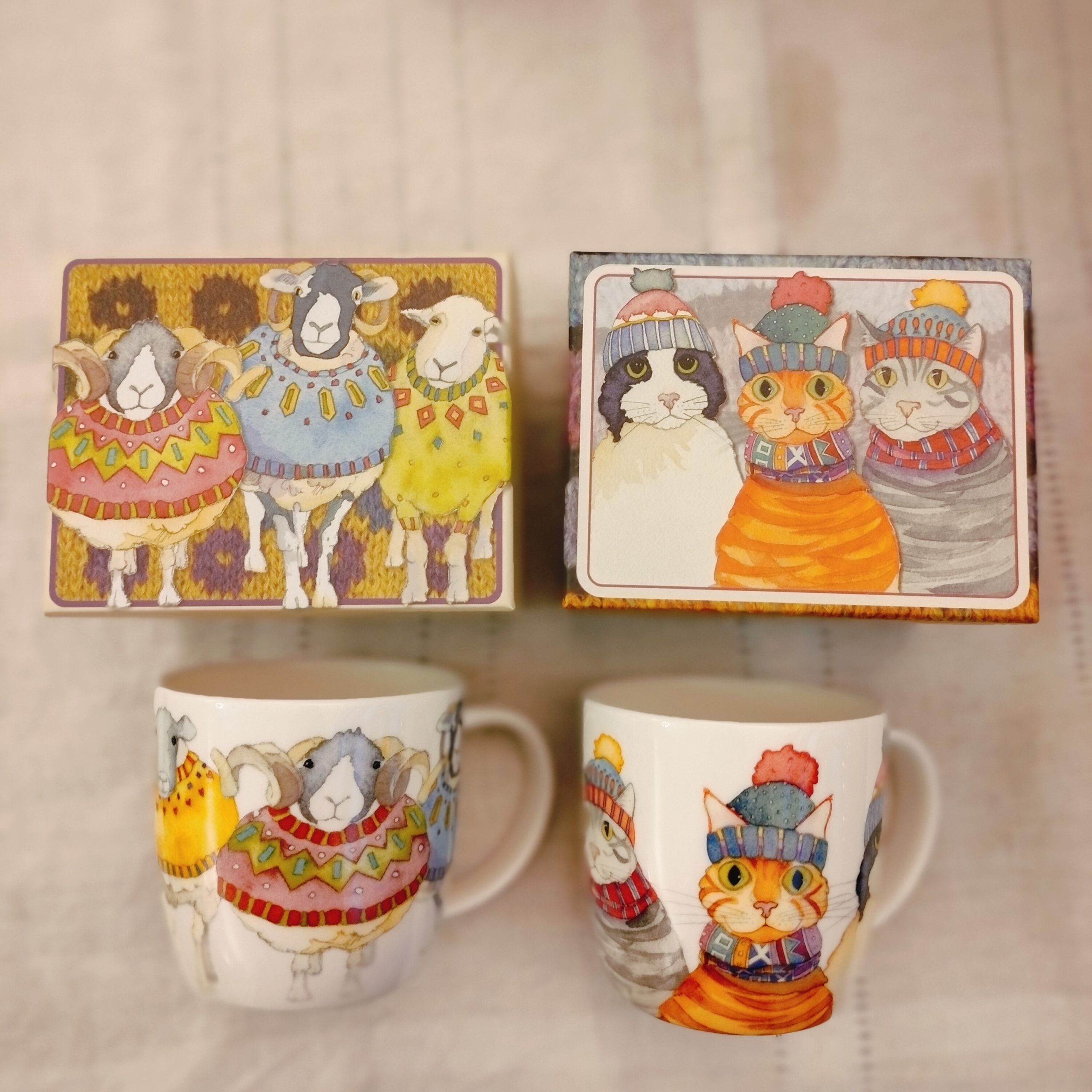 Suloiset Emma Ball malliston teemukit kissa ja lammas kuoseilla. Mukit toimitetaan kauniissa pahvirasiassa, joka soveltuu jatkossa kaikenlaiseen piensäilytykseen.